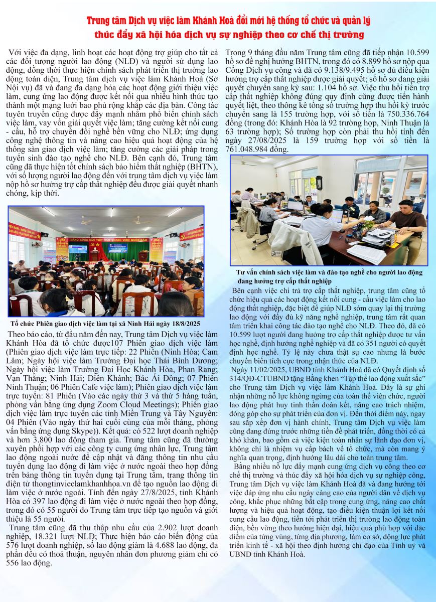 Trung tâm Dịch vụ việc làm Khánh Hòa đổi mới hệ thống tổ chức và quản lý thúc đẩy xã hội hóa dịch vụ sự nghiệp theo cơ chế thị trường.