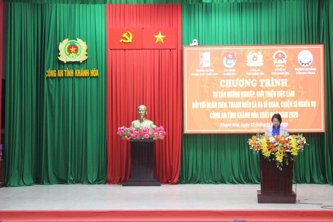 Sáng ngày 22/01/2026, Công an tỉnh Khánh Hòa phối hợp Trung tâm Dịch vụ việc làm Khánh Hòa tổ chức Chương trình tư vấn hướng nghiệp, giới thiệu việc làm đối với đoàn viên, thanh niên là hạ sĩ quan, chiến sĩ nghĩa vụ Công an tỉnh Khánh Hòa xuất ngũ năm 2026.