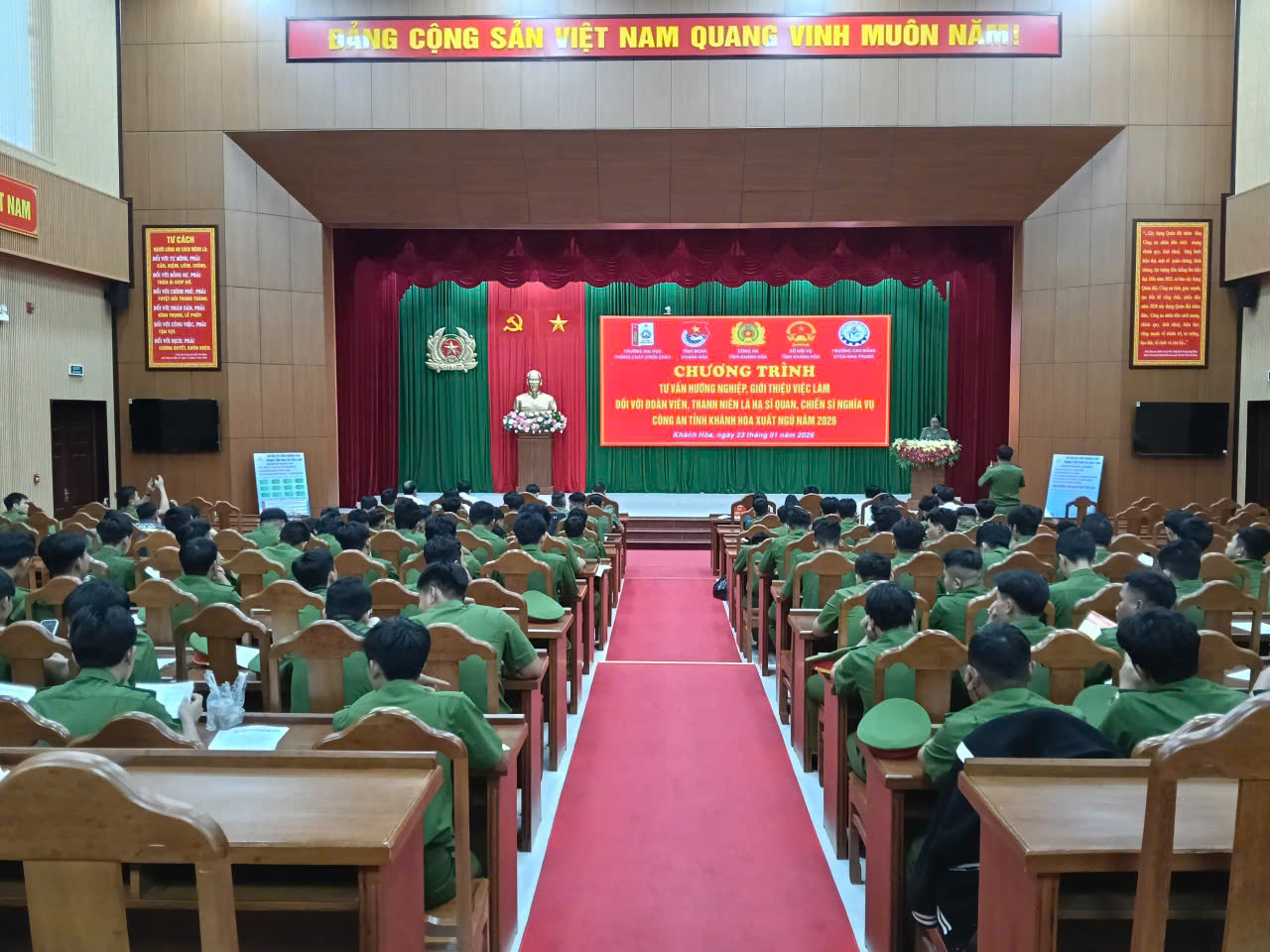 Tại chương trình, có sự tham gia của Công ty TNHH May Tiến Thuận, Công ty Cổ phần Đầu tư An Phát – Nhà máy may Cam Ranh, Công ty Cổ phần Cung ứng Nhân lực Mekong cùng với 103 đồng chí là hạ sĩ quan, chiến sĩ nghĩa vụ Công an nhân dân chuẩn bị xuất ngũ được tư vấn, thông tin về các ngành nghề đào tạo, nhu cầu tuyển dụng lao động, điều kiện tuyển sinh, chính sách hỗ trợ học nghề. Đồng thời, tư vấn các chương trình xuất khẩu lao động phù hợp với trình độ, sức khỏe và nguyện vọng của từng chiến sĩ. Các chiến sĩ cũng đã được đại diện đơn vị giải đáp thắc mắc liên quan đến chế độ, chính sách dành cho hạ sĩ quan, chiến sĩ sau khi hoàn thành nghĩa vụ Công an nhân dân; định hướng lựa chọn nghề nghiệp, việc làm ổn định, lâu dài sau khi xuất ngũ.