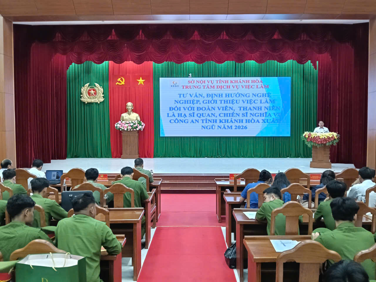 Sáng ngày 23/01/2026, tại Phòng họp trực tuyến cơ sở 2 – Công an tỉnh Khánh Hòa (đường Phan Bội Châu, phường Đông Hải), Công an tỉnh Khánh Hòa phối hợp Trung tâm Dịch vụ việc làm Khánh Hòa tổ chức Chương trình tư vấn hướng nghiệp, giới thiệu việc làm đối với đoàn viên, thanh niên là hạ sĩ quan, chiến sĩ nghĩa vụ Công an tỉnh Khánh Hòa xuất ngũ năm 2026.