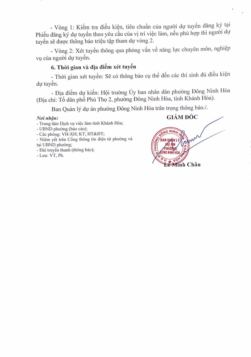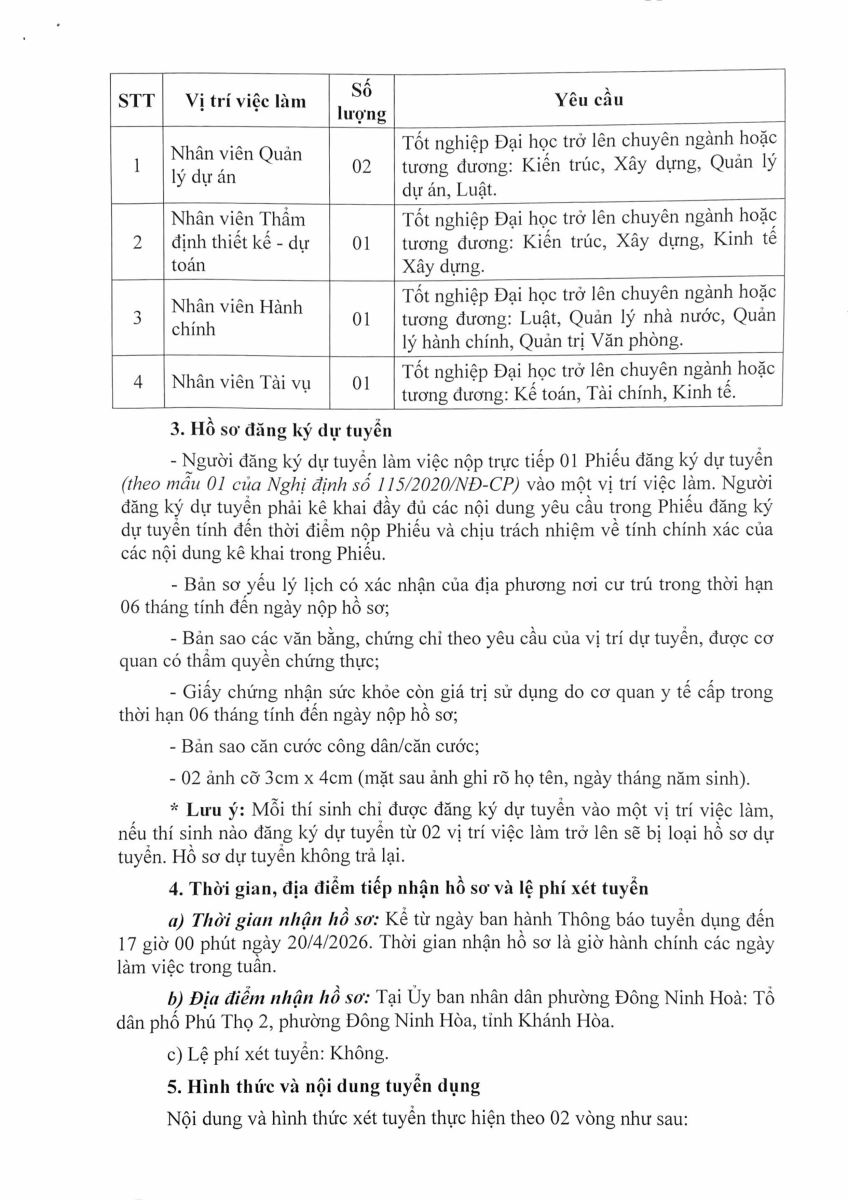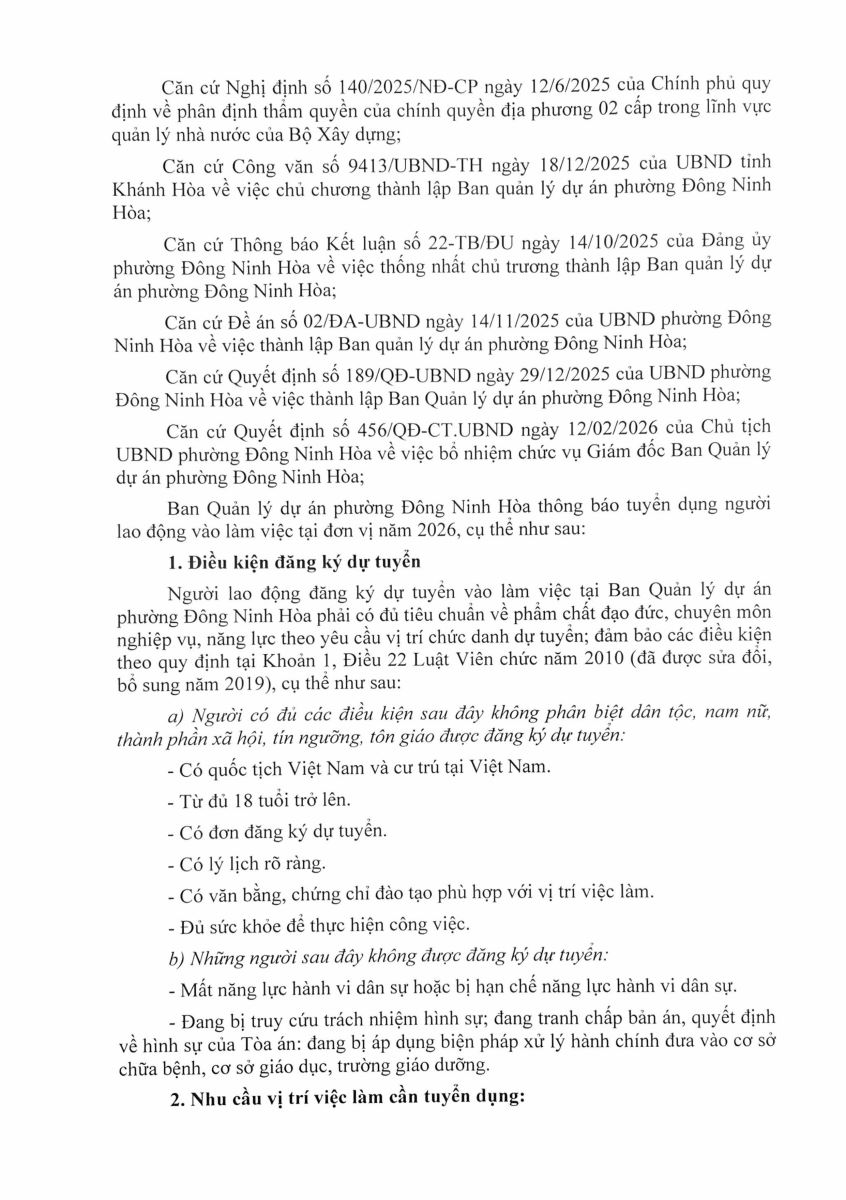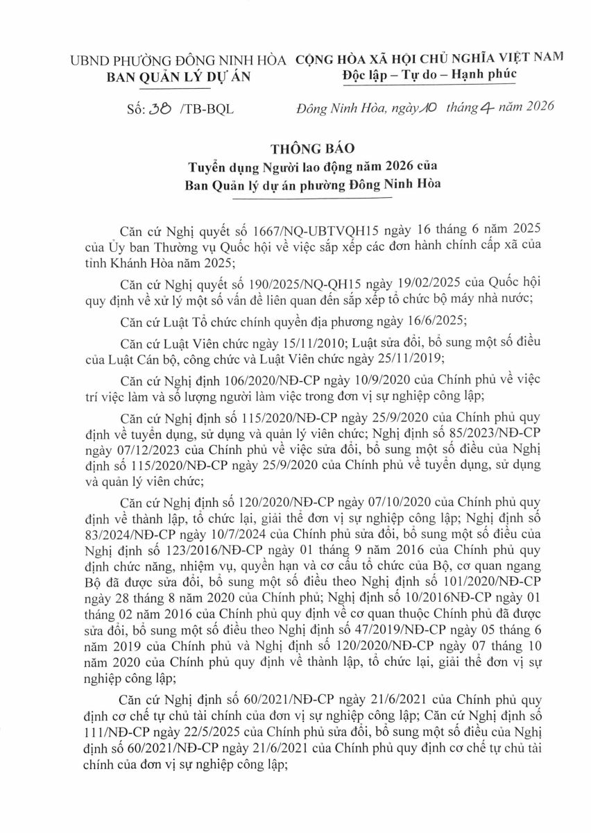 Thông báo Tuyển dụng Người lao động năm 2026 của Ban quản lý dự án phường Đông Ninh Hòa