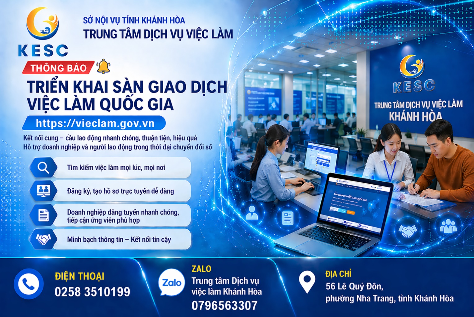 Trung tâm Dịch vụ việc làm Khánh Hòa trân trọng thông báo tới các doanh nghiệp, cơ sở sản xuất kinh doanh và người lao động trên địa bàn tỉnh Khánh Hòa về việc triển khai Sàn giao dịch việc làm quốc gia trên môi trường số tại địa chỉ: https://vieclam.gov.vn.