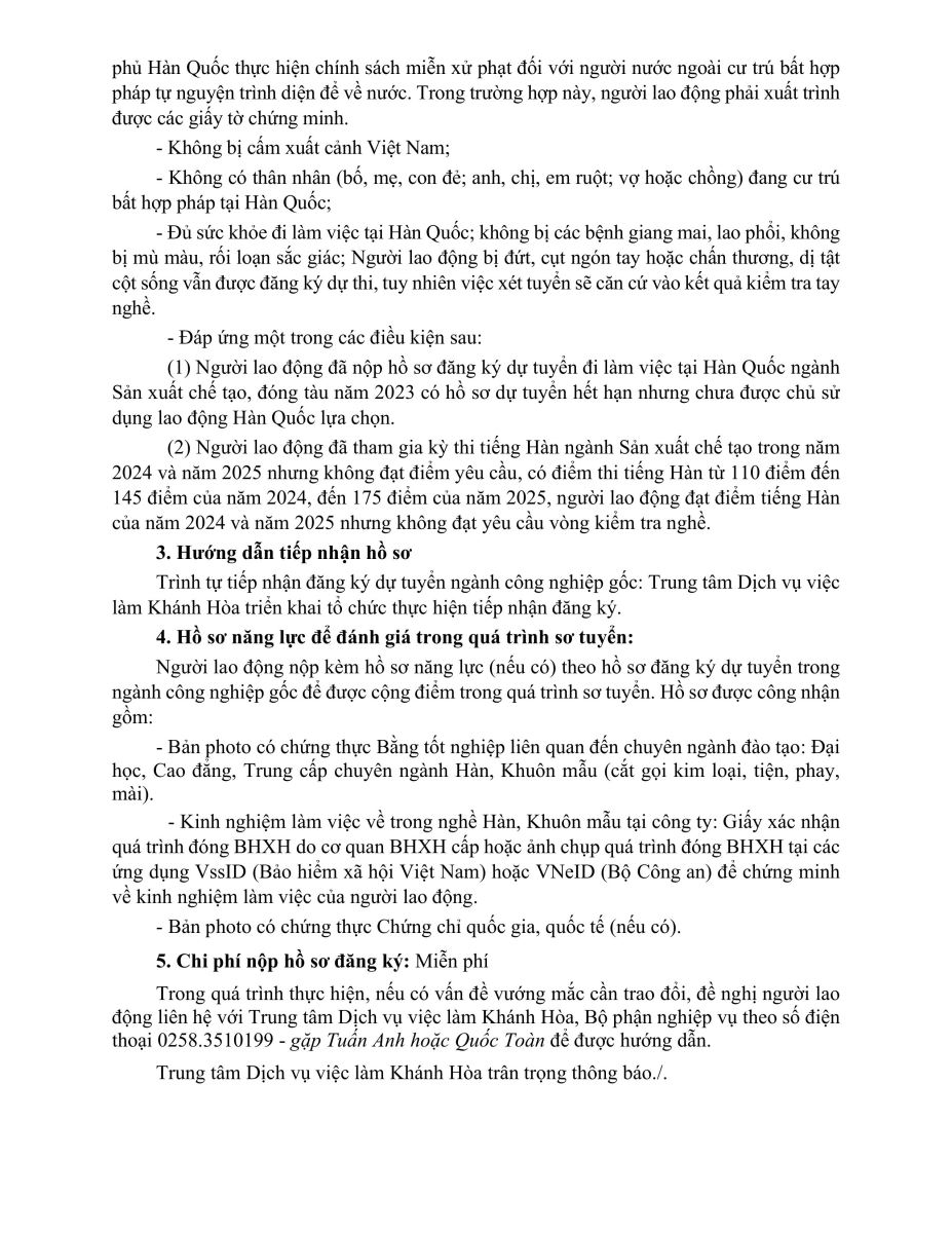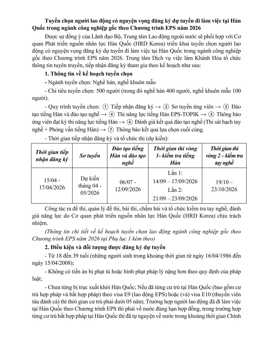 Tuyển chọn người lao động có nguyện vọng đăng ký dự tuyển đi làm việc tại Hàn Quốc trong ngành công nghiệp gốc theo Chương trình EPS năm 2026